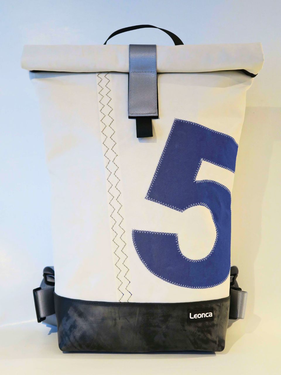 Der Rucksack ist aus recyceltem Segel mit einmer aufgenähten Zahl, der Boden aus Traktorschlauch